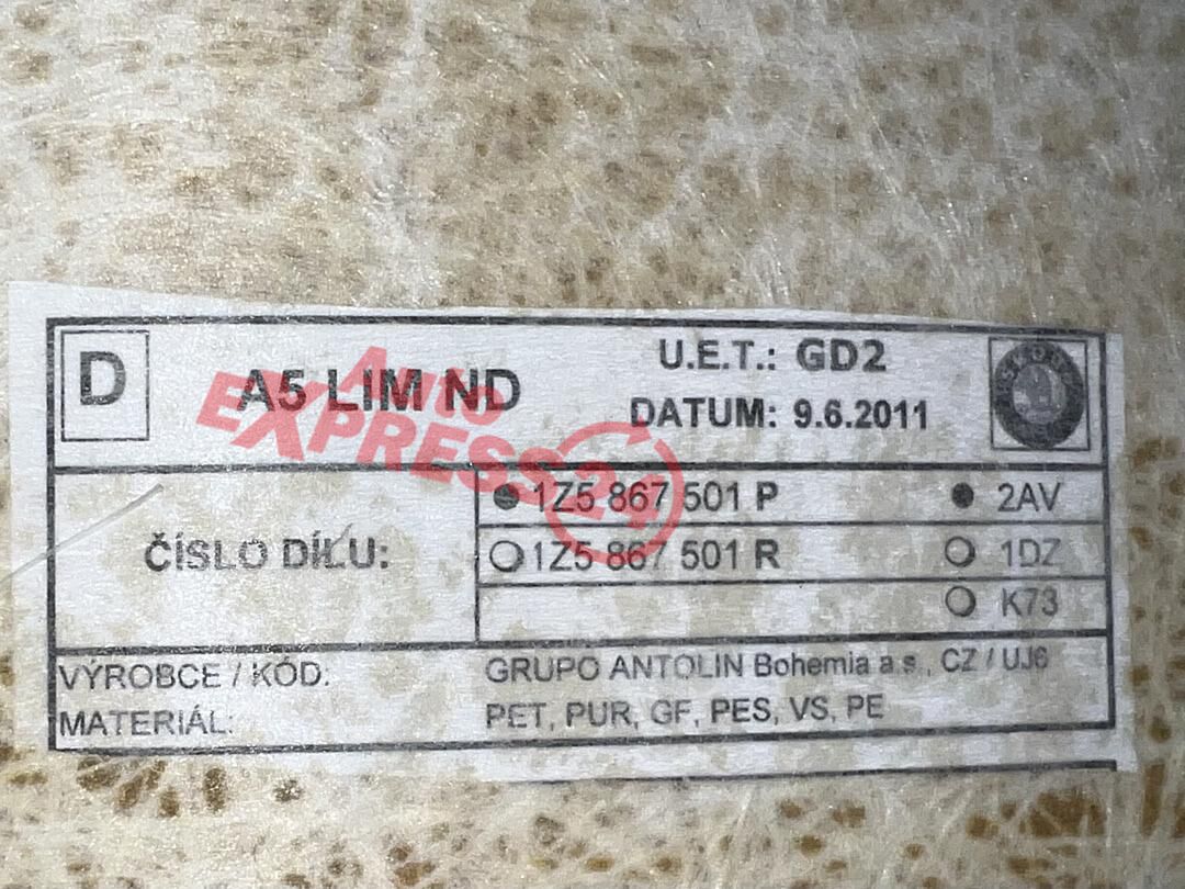 Stropnice panel stropu perlově šedá kód barvy 2AV z vozu Škoda Octavia 2 facelift sedan r.v. 2012