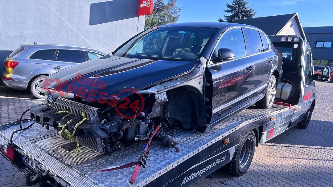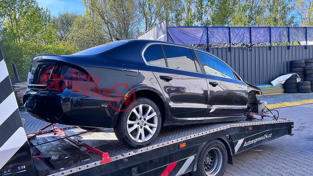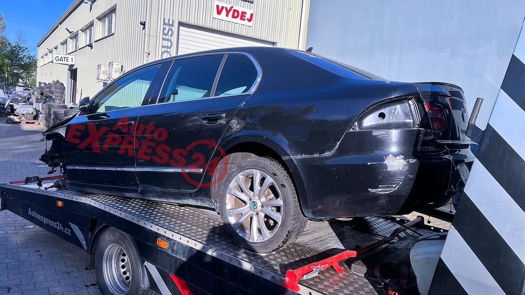 Vůz na náhradní díly Škoda Superb 2 sedan r.v. 2011 černá metalíza kód barvy LF9R 9910 1Z1Z benzínový motor 3.6FSI V6 191KW kód motoru CDV CDVA šestistupňová automatická dvouspojková DSG převodovka pro pohon všech kol 4x4 4Motion kód převodovky MTW číslo haldexu 0BR525010B